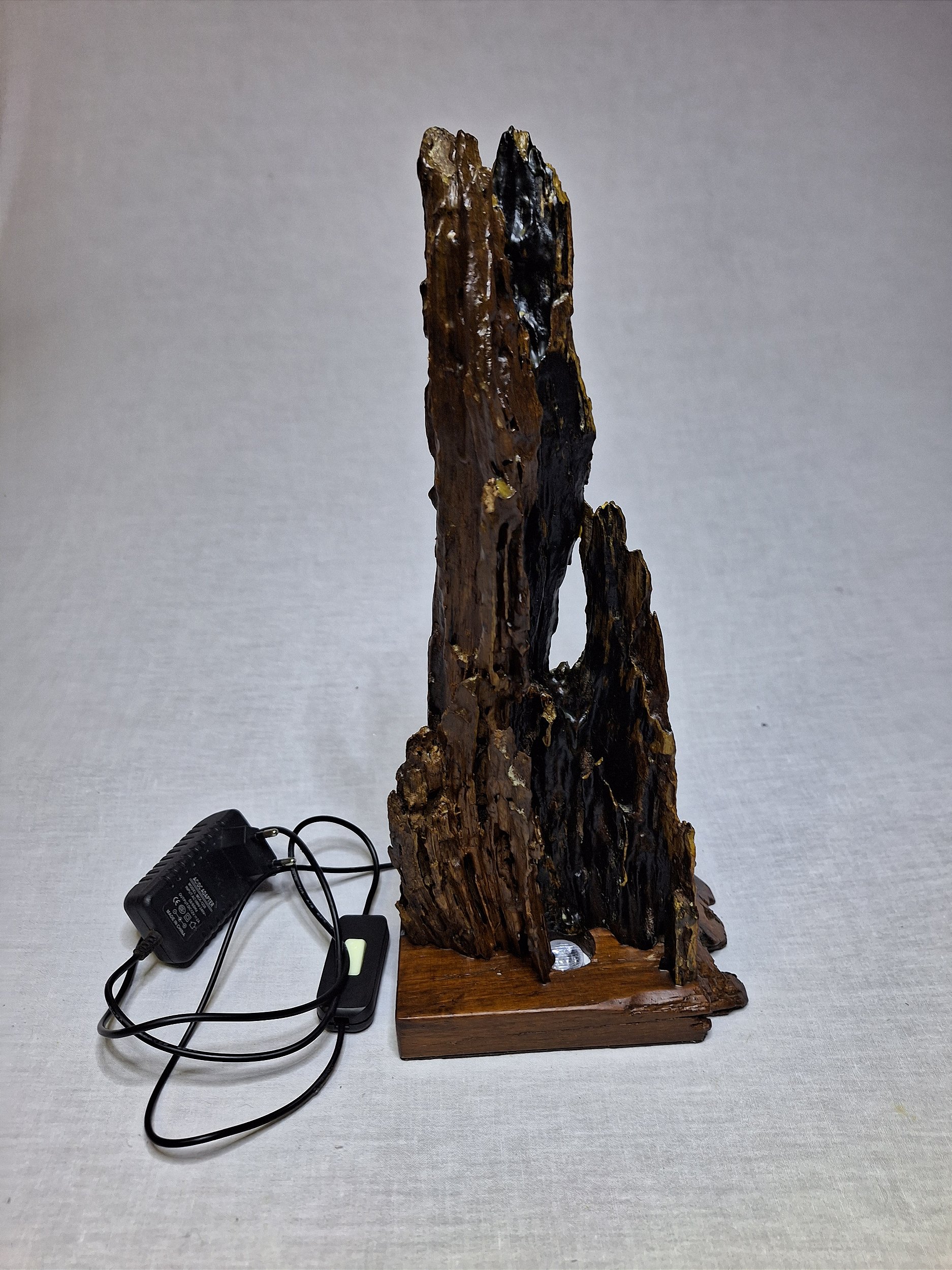 Luminária em madeira maciça, confeccionada com tronco de árvore parcialmente apodrecido e base em madeira de demolição.