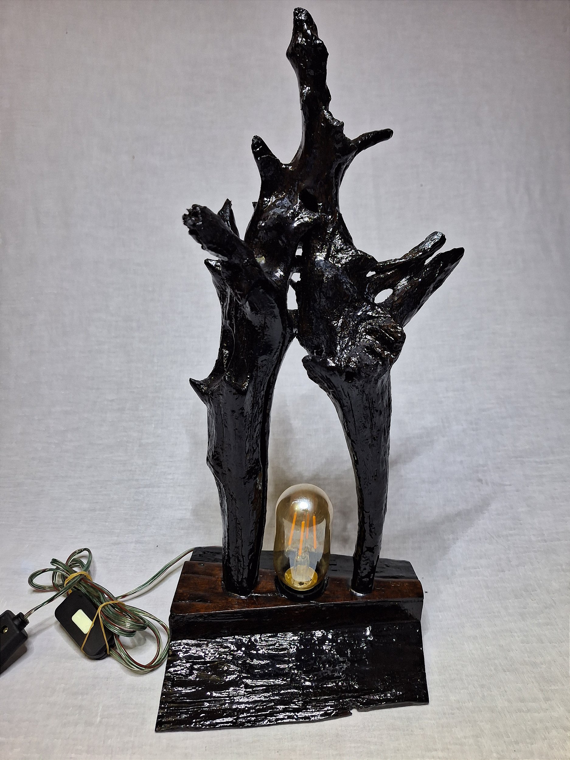 Luminária em madeira maciça,confeccionada com raiz de árvore coletada em leito de rio e base em madeira nobre de demolição.