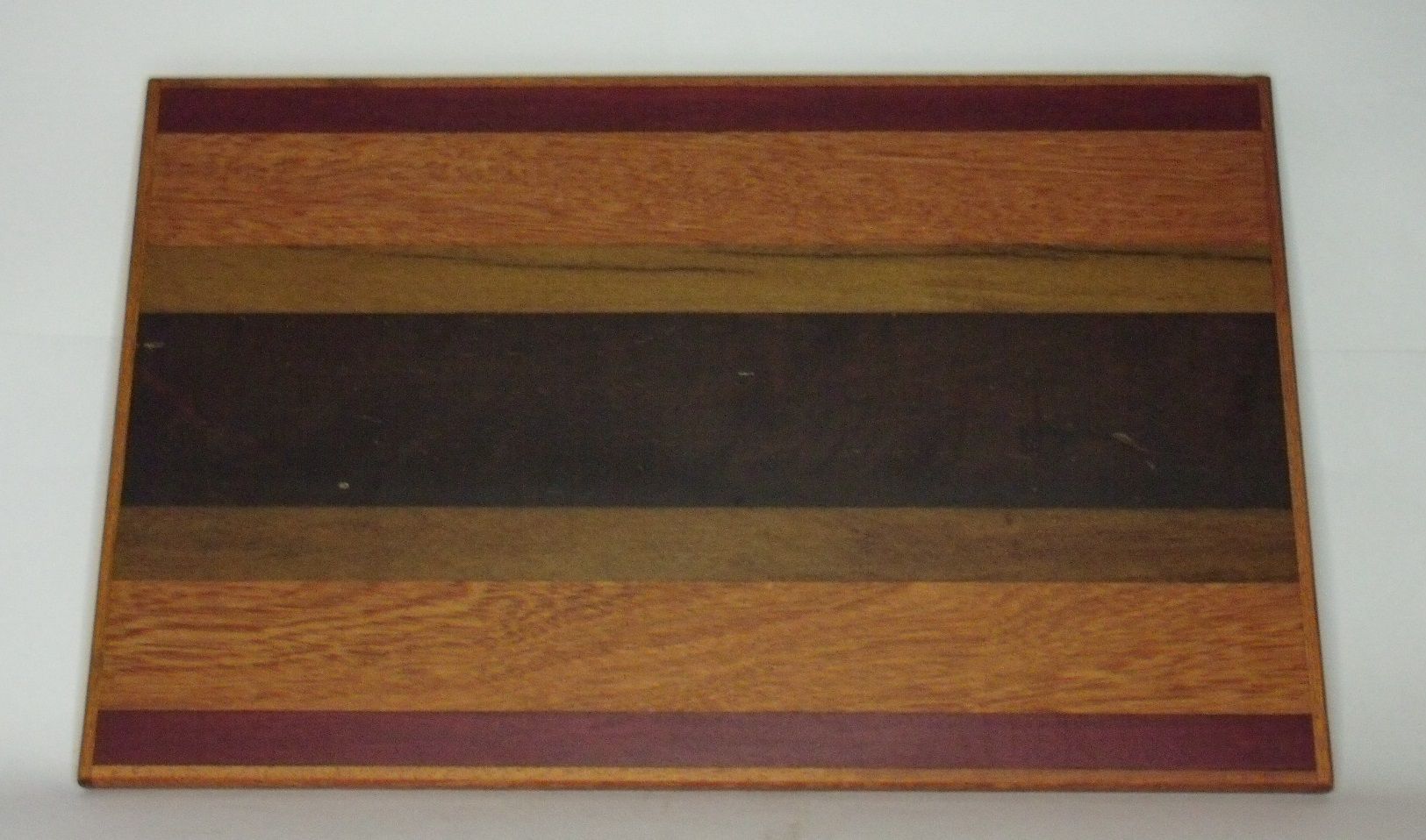 Tábuas de corte ou para frios marchetadas com madeiras maciças e design único.